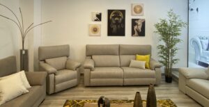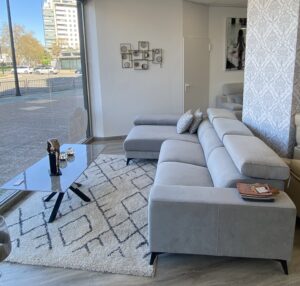 Entrando a la izquierda se encuentra el «MODELO JAZZ» en medida de 254cm de ancho y 85cm de fondo. Es uno de los modelos que podemos denominar de «FONDO REDUCIDO”. Destaca por el toque moderno de sus brazos y por su pata de 10cm con acabados en metal o madera. Con esta altura de patas ya es suficiente para que pueda pasar por debajo del sofá el robot de limpieza. Está tapizado en la tela Cavalli 3 de Froca en tono gris claro, con tratamiento anti-manchas y la posibilidad de lavar la tapicería en lavadora. Este modelo posee cabezal reclinable en 6 posiciones, asientos Viscoelásticos motorizados. Se fabrica en sofá lineal, sofá chaise longue, sillón o rinconera y destaca por la amplia variedad de medidas en asientos y brazos.