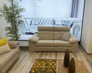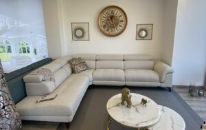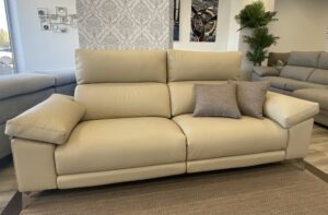 Muy cercano a la puerta de entrada llama la atención nuestro «MODELO MOON» tapizado en piel de vaca color pietra. Situado a la izquierda del pasillo, con un fondo de 91cm, una altura de 105, riñoneras viscoelásticas inyectadas de 10cm de grueso, altas densidades de gomaespuma de asiento, cojín apoyabrazos tipo siesta, patas metálicas color cromo, cabezales reclinables, posibilidad de automatizar los asientos, posibilidad de chaise longue deslizante/reclinable, opción brazos arcón y un sinfín de posibilidades. Se encuentra expuesta en medida 232cm con dos asientos de 88cm y brazos de 28cm. Disponemos de más de 200 versiones diferentes de piel y más de 2000 posibilidades en tela.