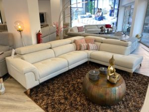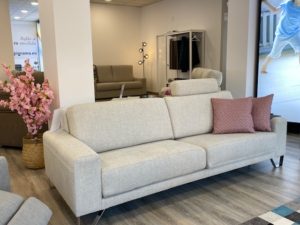 – Modelo abril: Destaca sobre el resto de modelos por su diseño moderno, sus dos amplios asientos de 118cm para conseguir un sofá de 286cm con asientos relax eléctricos, cabeceros abatibles de sistema italianos, sus espumas de 42 kg y una gran variedad de patas de madera o metal donde poder escoger.